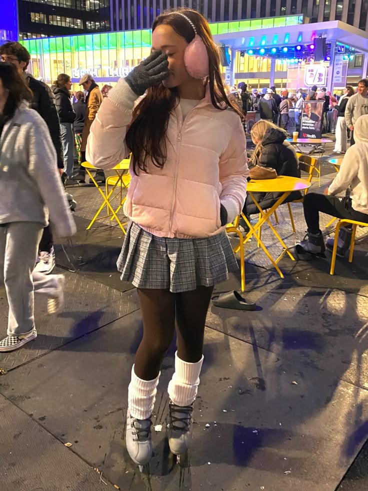 Okay so the pink puffer over a plaid mini skirt with black tights is honestly such a clever combo. It’s giving preppy winter energy and I mean that as the highest compliment. The white leg warmers and earmuffs tie it all together without even trying. So if you usually reach for boring layers on ice, you ought to rethink that immediately and try this instead.