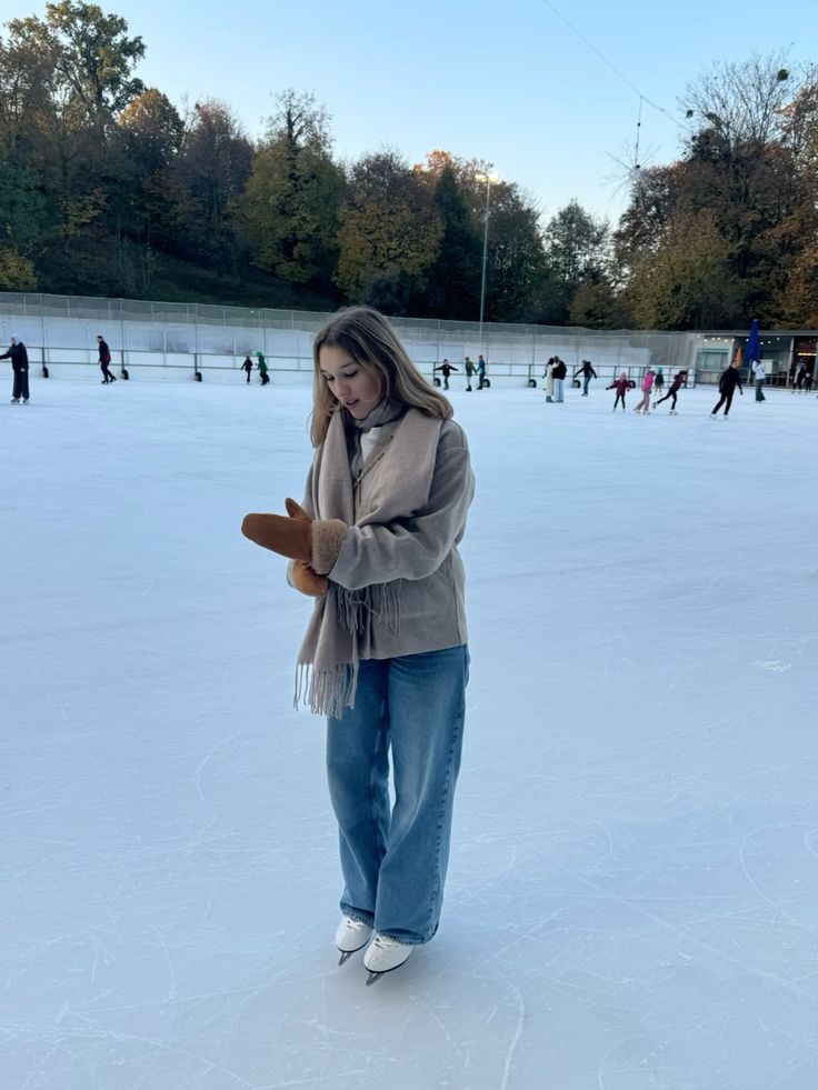 Quiet luxury called and this outfit answered without even flinching. The camel tones from the blazer jacket down to the fringed scarf and faux fur mittens create this perfectly cohesive winter look that feels so effortless. Wide leg jeans are the right call here because they move well on skates. You know that person at the rink who looks like they wandered off a fashion shoot? This is her.