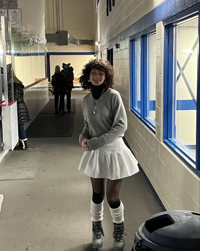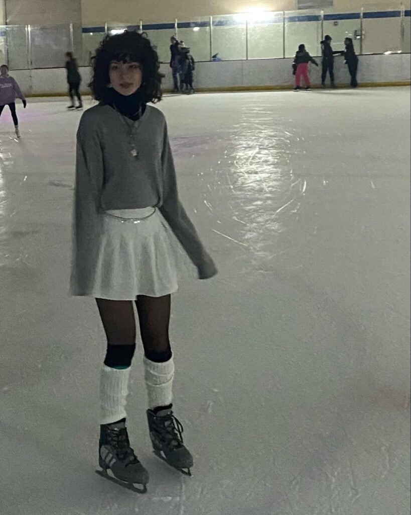 Off the ice and still the cutest person in the building. That grey v neck over a black turtleneck is such a good layering move honestly, and the white pleated skirt keeps things light and playful. The leg warmers add just the right amount of skater energy. Basically this whole look says I came to have fun and also look amazing, so both things are happening simultaneously.