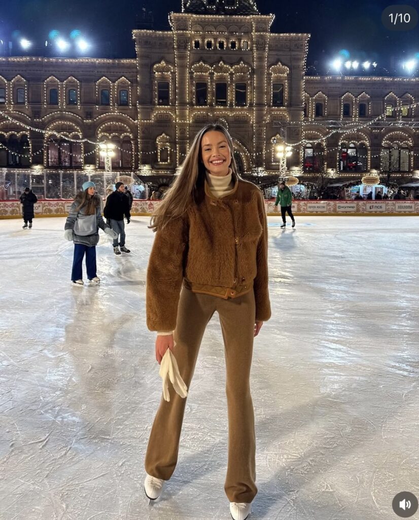 Brown on brown on brown and it has absolutely no business looking this good. The faux fur cropped jacket over camel wide leg trousers with a cream turtleneck peeking out is such a considered combination. Red Square as a backdrop does not hurt, I mean, however you could pull this off at any rink and still look like the most stylish person on the ice.