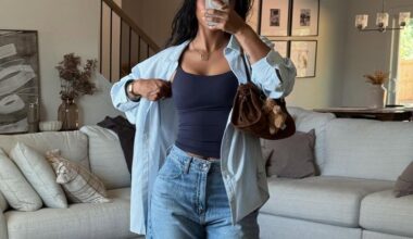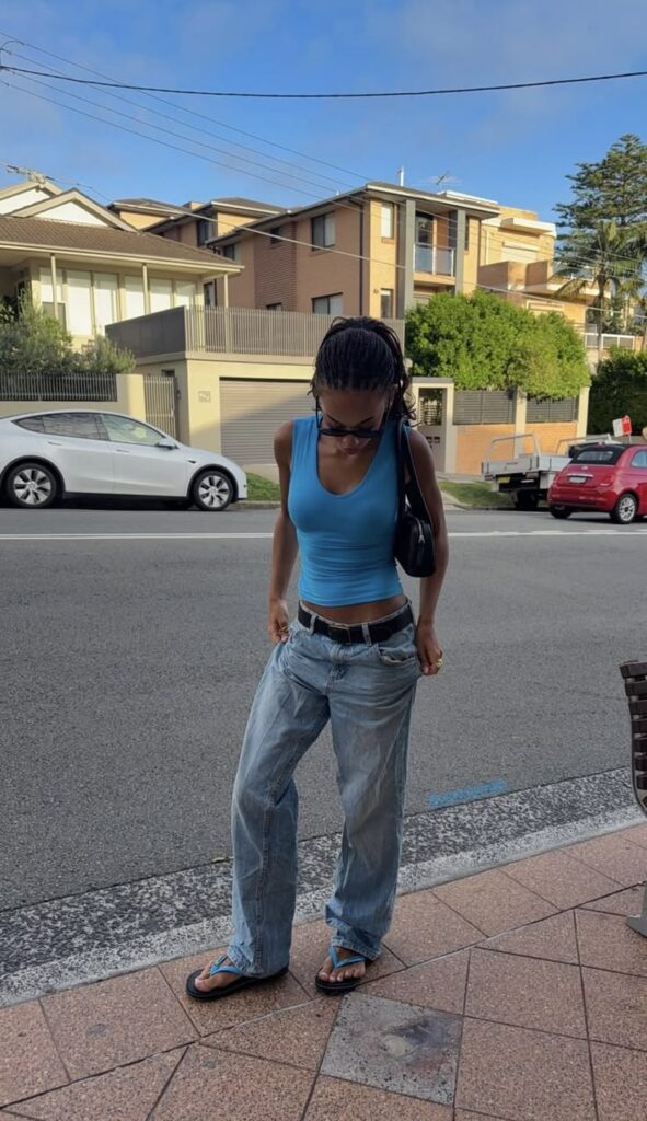 For anyone who thinks colour cannot anchor a simple outfit, this blue tank with low rise light wash jeans and a black belt proves otherwise. It works because the blue is bold enough to carry the look on its own. Add a small shoulder bag, some thin sunglasses and matching blue flip sandals. So fresh, so warm weather, so done.