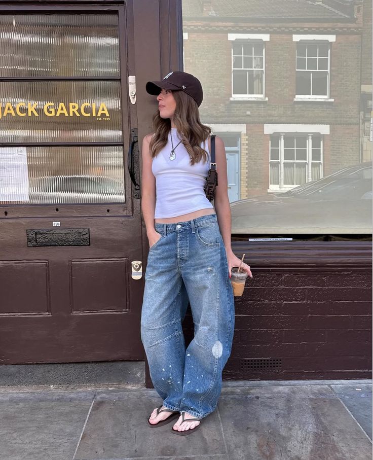 Paint splattered workwear jeans with a white ribbed micro tank, a black logo cap and a Fendi crossbody is the kind of outfit that looks like it took zero thought but actually requires very good jeans. The flat flip sandals are essential for keeping the whole thing casual. So good for anyone who wants cool without trying too hard.