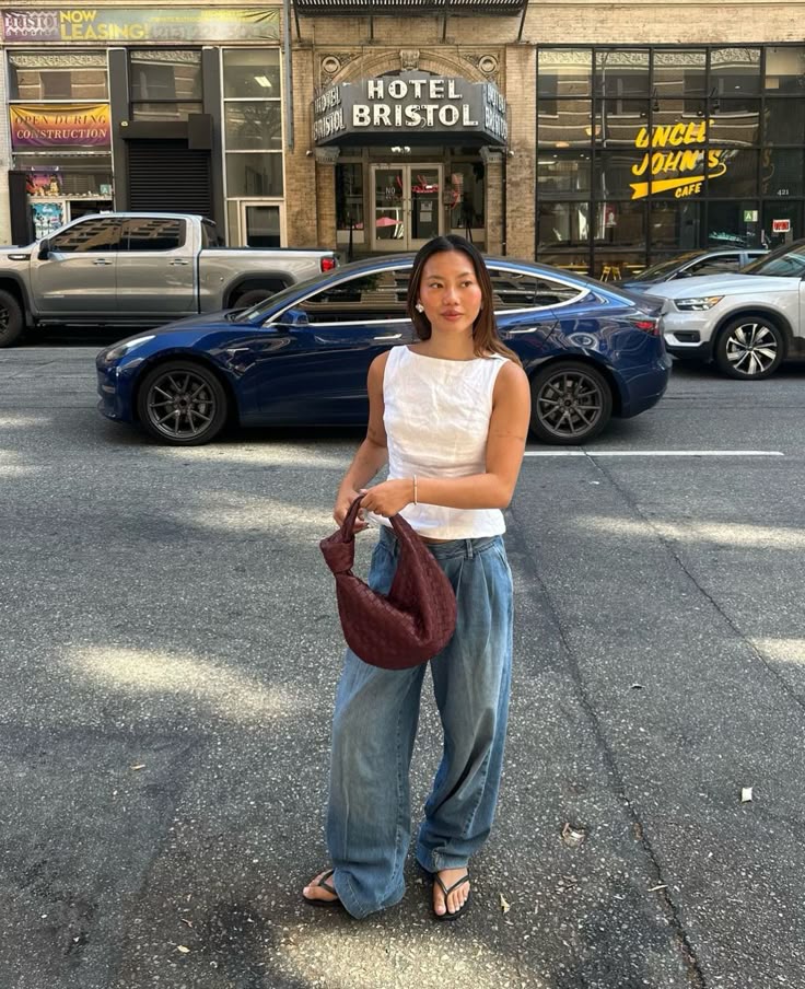 Honestly a white sleeveless crop top and loose wide leg jeans is such a clean canvas but that deep burgundy woven bag is what takes this from basic to so good. Pearl earrings, a simple bracelet, black flip sandals. The contrast of the dark accessory against all that light wash denim is genuinely the whole move here. So easy to recreate.