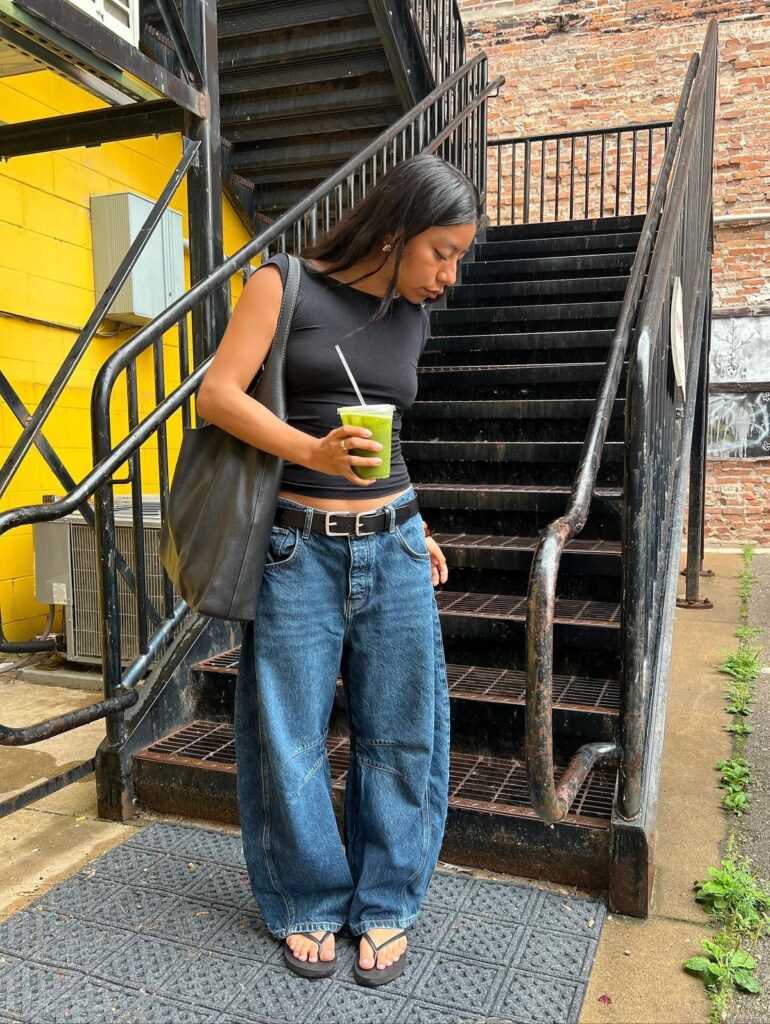 There is something about a fitted dark crop top belted into roomy barrel jeans with a leather tote and flip flops that just screams intentional downtown energy. The belt is the key styling detail honestly. It gives definition without tucking and the whole look reads so put together even though it is basically two pieces. I mean, effortless.