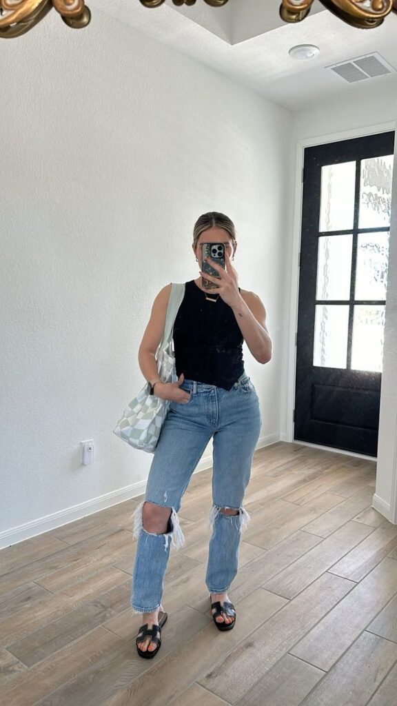 A simple fitted black tank, straight leg raw edge jeans and flat Hermès style sandals is so clean it barely needs anything else. However that sage green checked shoulder bag is the whole personality of this look. It adds playfulness to an otherwise minimal outfit without overwhelming anything. Honestly so smart and so easy to copy.