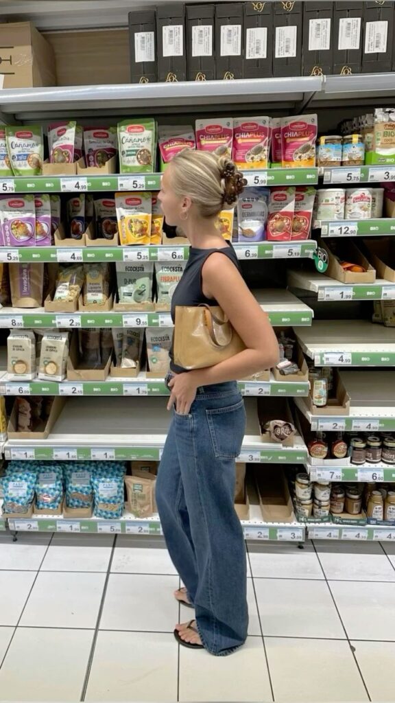 Dark navy barrel jeans with a fitted black sleeveless top and a tan patent leather tote looks elevated and polished even while shopping for chia seeds, apparently. The updo and thong sandals keep it practical. So this is your reminder that going to the shops is not an excuse to dress like you gave up. Basic pieces, good fit, great bag.