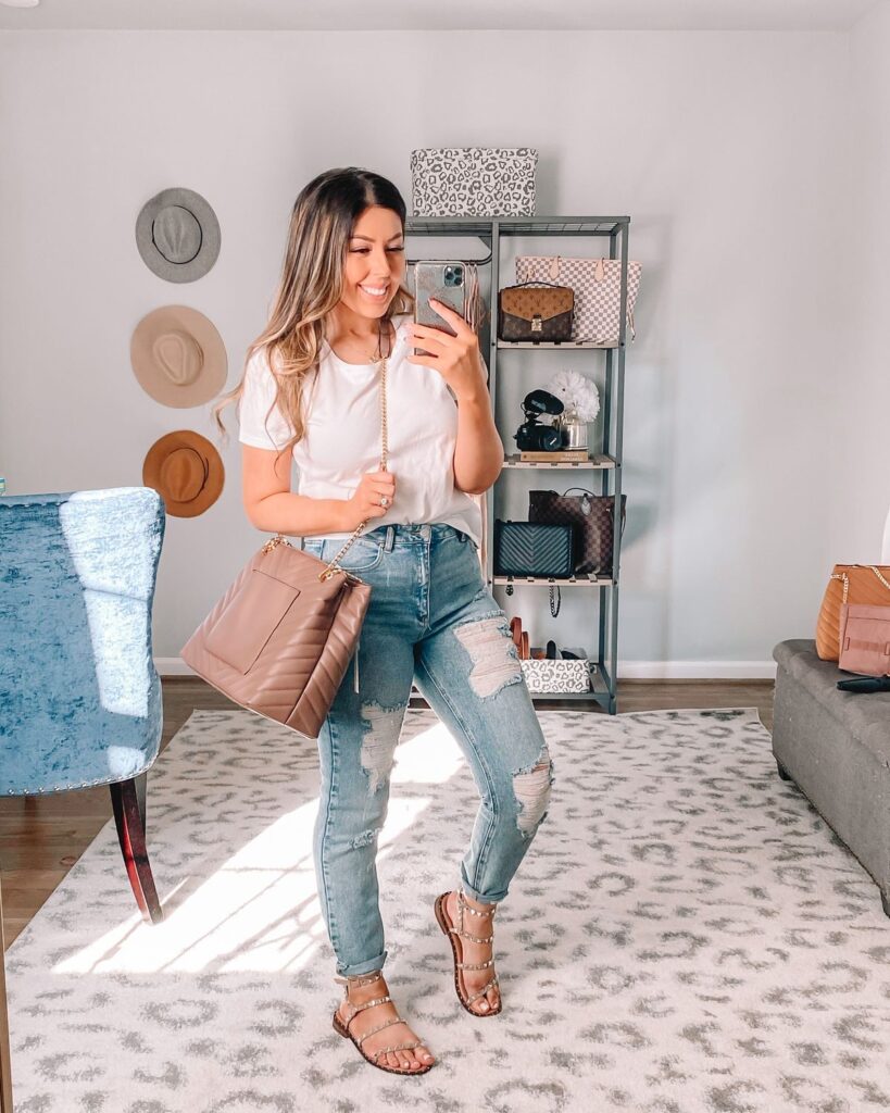 Sometimes the simplest combinations hit the hardest. A classic fitted white tee half tucked into light wash distressed jeans with studded sandals and a mauve quilted bag is honestly foolproof. The studded sandal detail is what stops this from being too basic and the bag colour keeps it warm and cohesive. This one works every single time.