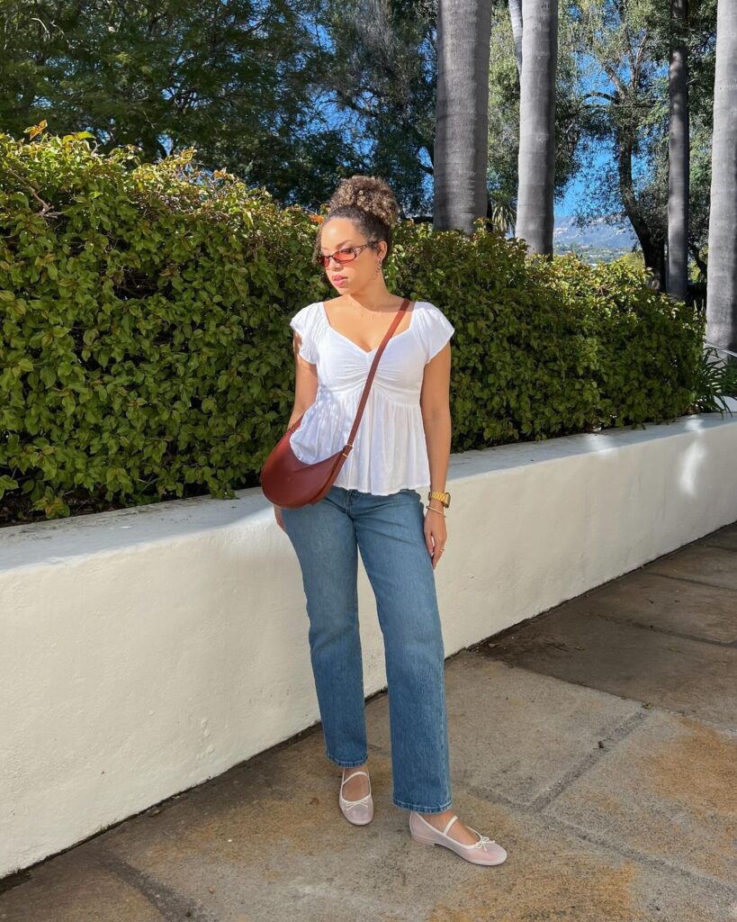Soft, feminine and totally wearable. A white ruched peplum top over straight leg jeans with blush ballet flats and a deep burgundy shoulder bag is giving warm afternoon energy. The tinted oval sunglasses and gold watch add just enough personality. This is the outfit for anyone who wants to look put together without the effort of deciding what to wear.