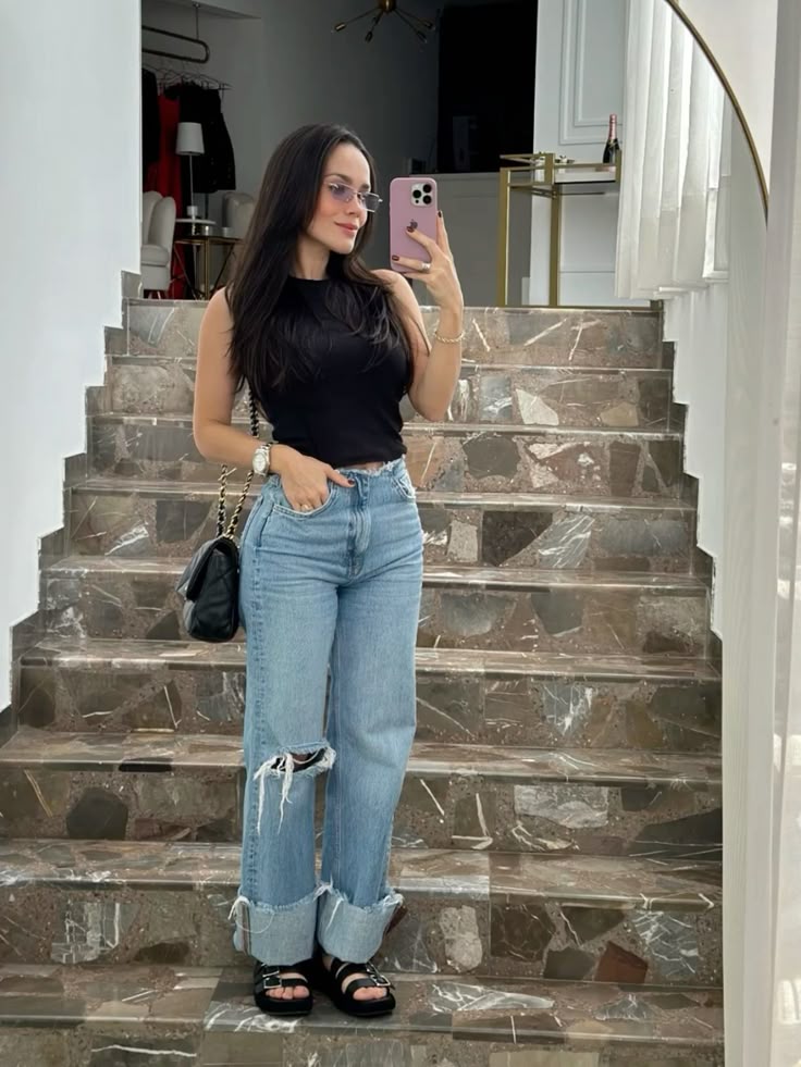 The Chanel bag is obviously doing heavy lifting here but the real lesson is how a fitted black tank tucked into light wash ripped jeans with chunky black sandals creates such a sharp silhouette. The cuffed hem draws attention to the shoes in the best way. A gold watch and those barely there glasses keep it polished without trying.