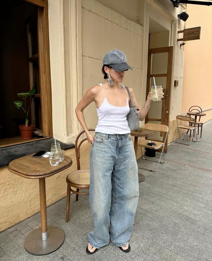This is the summer outfit formula that never fails. An oversized faded wide leg jean with a simple white tank, a grey cap, bold earrings and a matching suede shoulder bag is so nonchalant and so cool. The cap does a lot of the personality work here, so you ought to invest in a good one. Flip sandals keep the whole thing grounded.