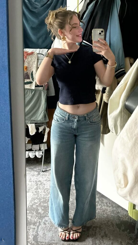 This navy baby tee and low rise wide leg jean combination is so Y2K without being costume about it. The gold flower earrings, the pearl necklace and the watch all feel curated in the best way. Strappy heeled sandals dress it up just enough. This is a great option for anyone who wants the low rise trend but needs a bit more polish in the shoe department.