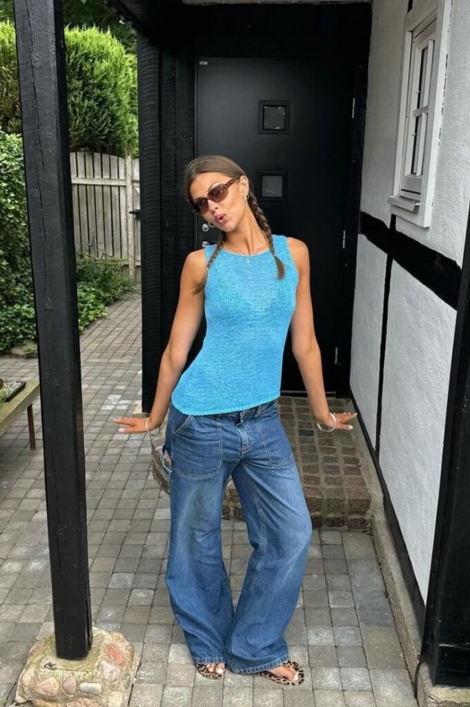 A textured bright blue fitted tank with loose dark wash carpenter jeans, Dutch braids, tortoiseshell sunglasses and leopard print mules is giving so much personality in one look. The leopard print against the bright blue is genuinely inspired. It works because both pieces are bold but the silhouette stays clean. So fun and so easy to recreate.