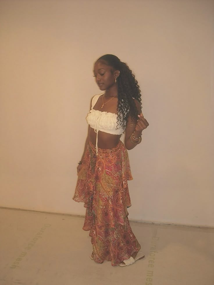 Okay so a white ruched crop top with a flowing paisley maxi skirt gives major bohemian goddess energy.