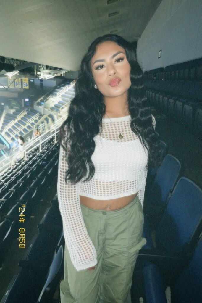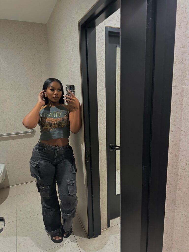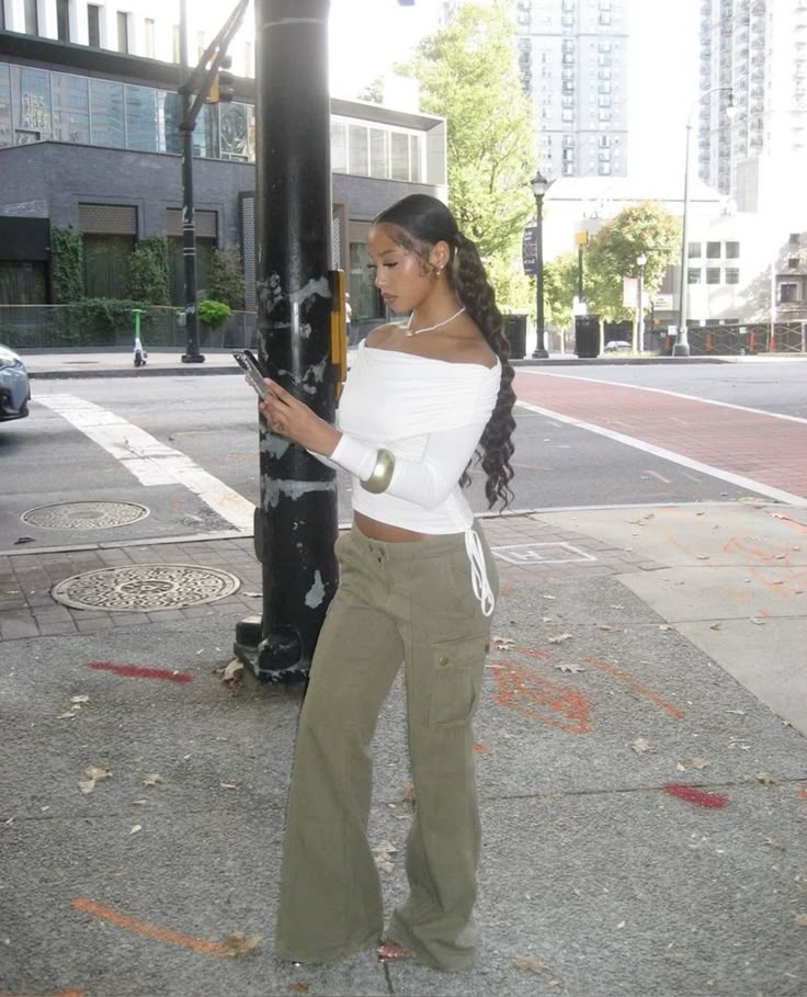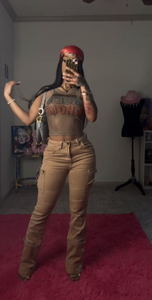 If you’re feeling bold, that graphic crop top with tan cargo pants and a red cap creates this whole streetwear inspired look.