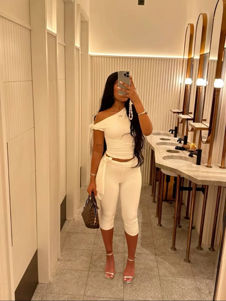 That one shoulder white top with matching capri pants creates such a clean, sophisticated silhouette.