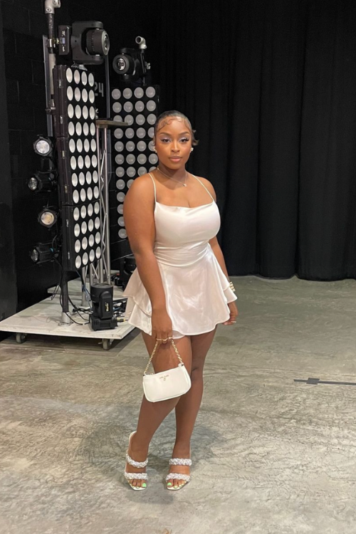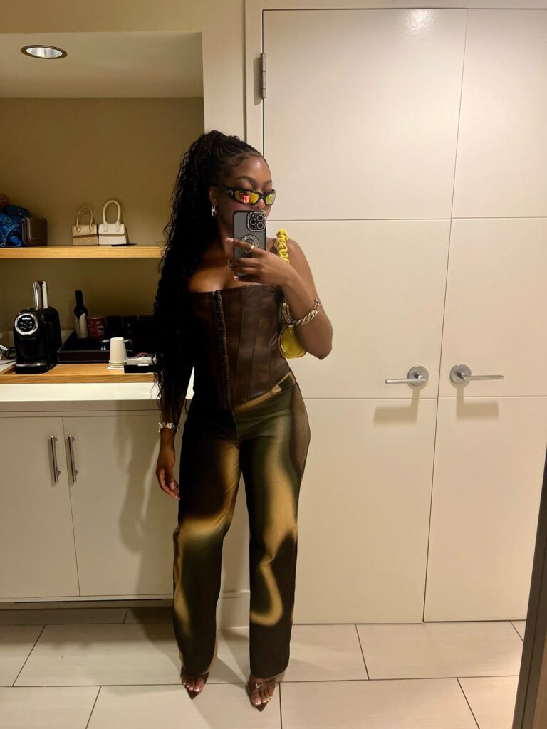 The mix of textures and that tiered silhouette creates movement when you’re dancing, and honestly, this feels very aligned with Jhené’s spiritual, earthy aesthetic. Keeping jewelry stacked but delicate adds personality, and the whole look feels special without being uncomfortable.