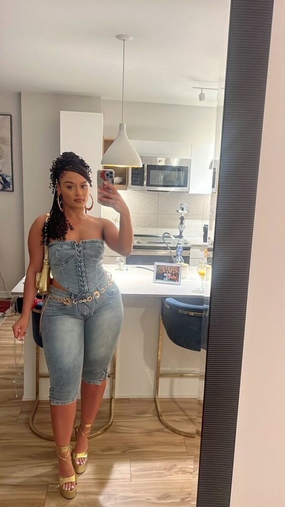 The floral printed corset with denim shorts creates this whole summery bohemian vibe that feels right for Jhené’s aesthetic.