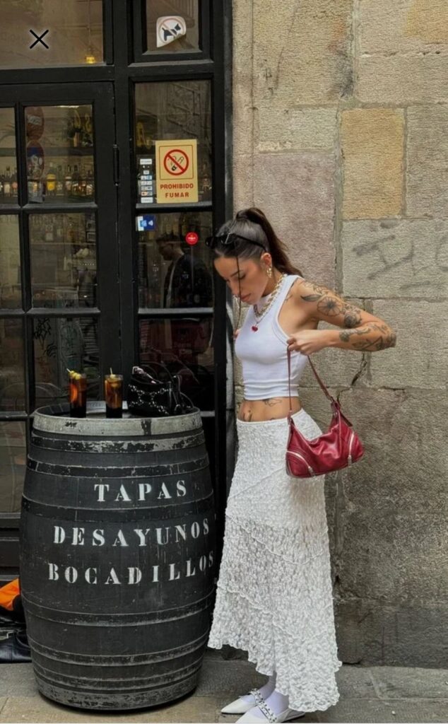 The white fitted tank, the white lace midi, the red shoulder bag dropping a hit of contrast.
