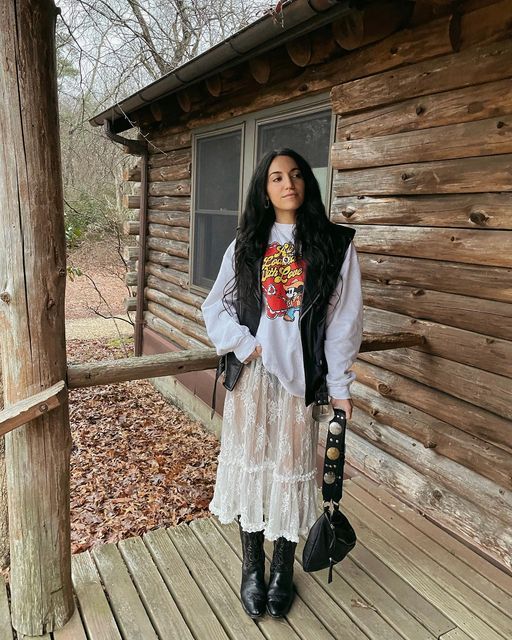 Graphic sweatshirt, puffer vest, lace midi skirt, lace up boots. It genuinely should not work this well.