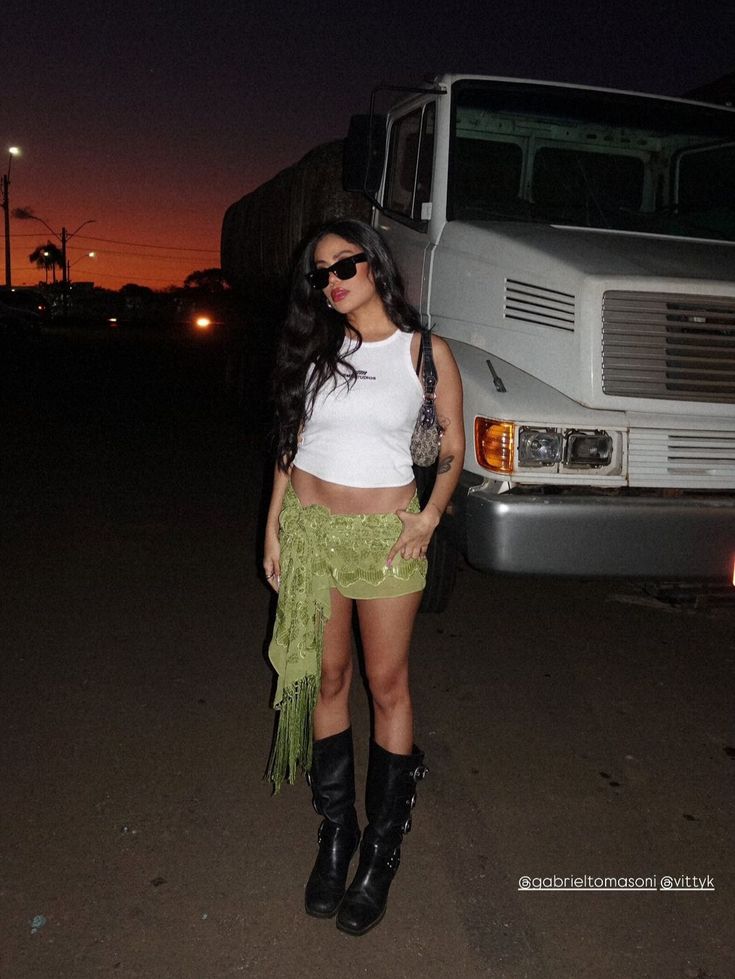 This one is for girls who don’t play safe. An olive green lace mini with fringe detailing, a white crop, chunky moto boots and a snakeskin bag photographed against a sunset?