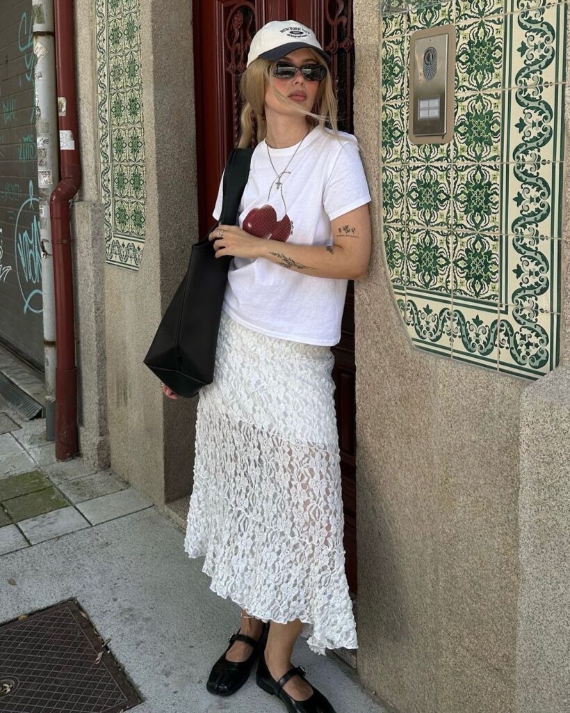 The graphic heart tee tucked loosely into a white textured lace midi with a baseball cap, black tote and Mary Jane flats is giving cool girl off duty in the best way.