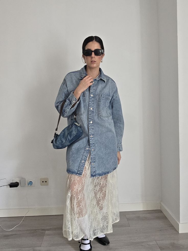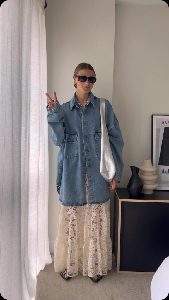 Nobody was ready for this level of casual cool. An oversized denim shirt worn open over a cream lace maxi with white socks and Mary Janes is basically the outfit of the moment. So simple, so considered, so good. The denim adds enough structure and weight that the lace underneath doesn’t feel too delicate or precious. Wear yours slightly unbuttoned so the lace skirt gets its moment.