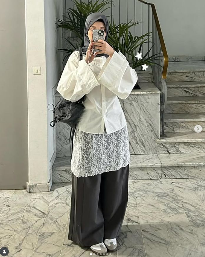 The white oversized shirt worn over a lace skirt so just the hem shows below is such a smart modest styling trick.