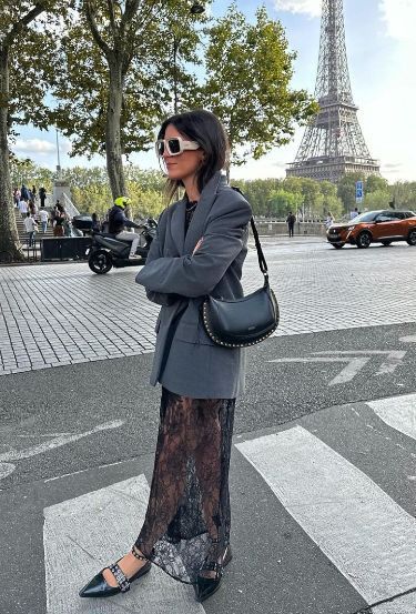 Grey oversized blazer, dark floral lace maxi, pointed kitten heels, structured shoulder bag. Standing in front of the Eiffel Tower like she does this every Tuesday.