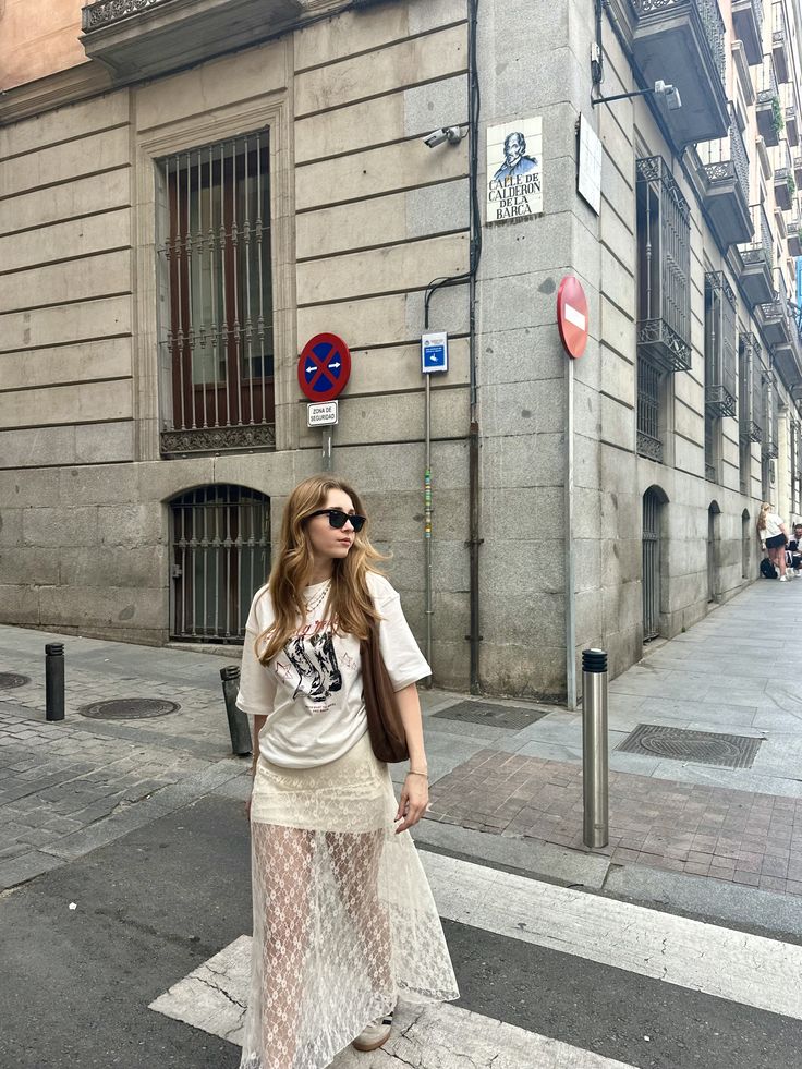 Washed out oversized graphic tee half tucked, white lace midi, stacked gold jewellery, ankle boots. It’s that deliberately undone quality that makes everything feel so effortlessly styled.