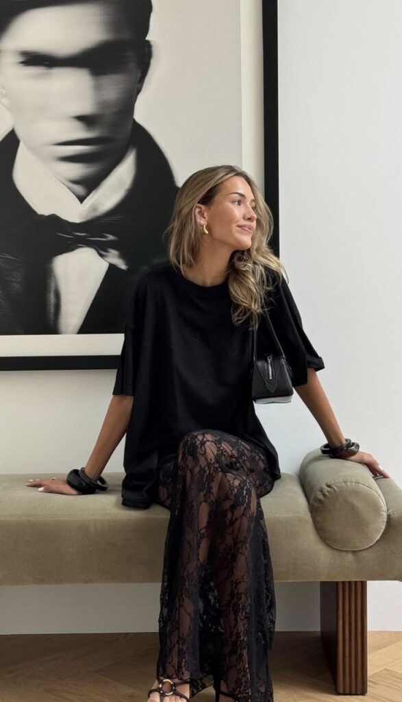 Oversized band tee, sheer lace maxi, loafers. That’s it. That’s the whole formula and it somehow looks like you spent an hour planning it.