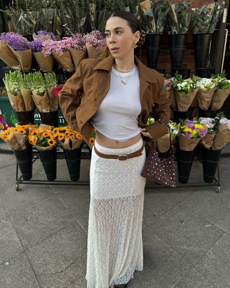 So the tan suede jacket thrown over a fitted white top with a lace maxi and a studded mini bag is giving effortlessly cool in a way that feels almost unfair.
