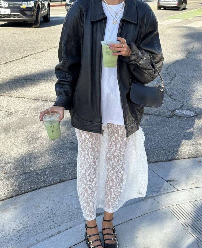 Oversized leather jacket, white tee, white lace skirt, buckle strap heels. This is the low effort high impact outfit you save for days when you want to look amazing without actually trying.