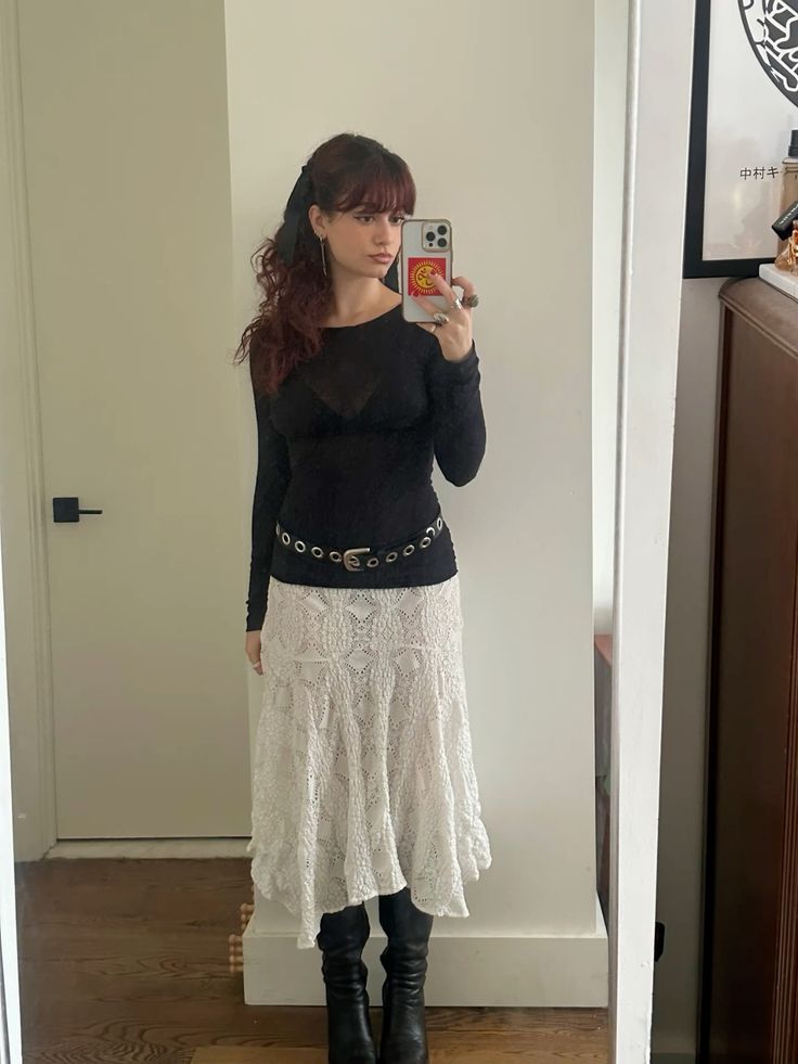 The black sheer lace long sleeve with a silver eyelet belt tucked into a white lace midi skirt is such a considered look. Knee high boots bring it all together and stop it from reading costumey.