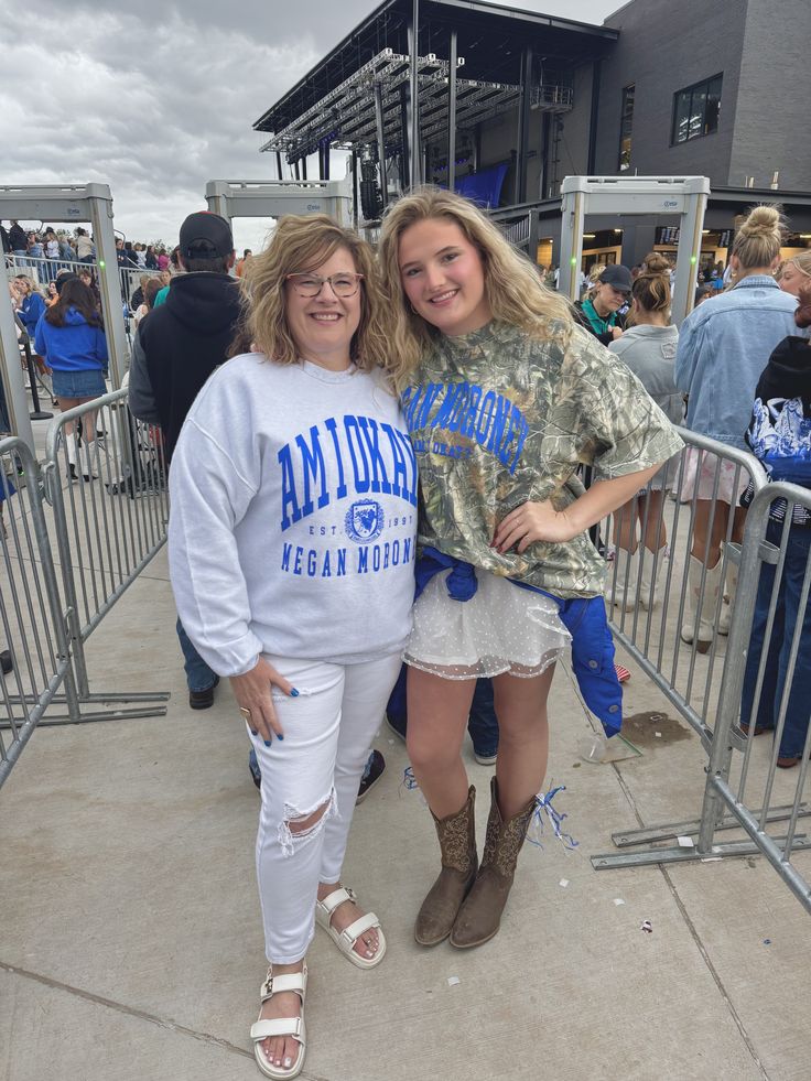 This one is so wholesome. The grey Megan Moroney sweatshirt with white ripped jeans and sandals is genuinely a solid and comfortable concert outfit for anyone who wants to look put together without overdoing it. Her daughter went full camo tee, lace skirt and cowboy boots which is a completely different energy, and yet side by side they both just work. Concert dressing really is for everyone.
