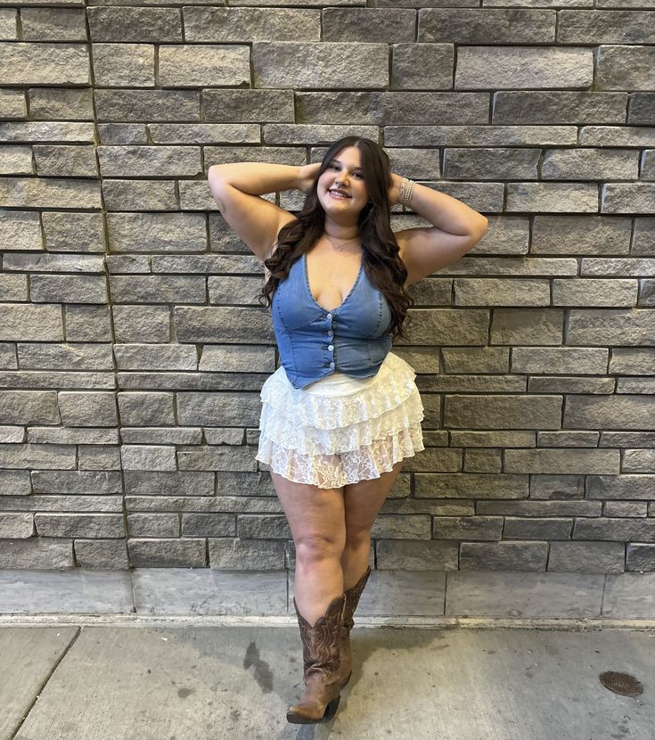 Ruffled gingham mini skirt with a white corset crop top and a straw hat is so country concert it almost feels too perfect, but it works completely. The stacked gold bracelets and layered jewelry are doing so much here. You ought to try this combination if you are going for that sweet southern summer aesthetic. It photographs beautifully and you will be comfortable all day. Basically no notes.