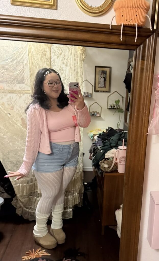 This one is for the girls who run cold and still want to look adorable. Layering a pink cable knit cardigan over a matching pink fitted top with a denim micro skirt and textured tights is so thoughtfully put together. The UGG boots and hair clips make it feel very personal and specific. You know this person has a very curated aesthetic and I respect it completely.