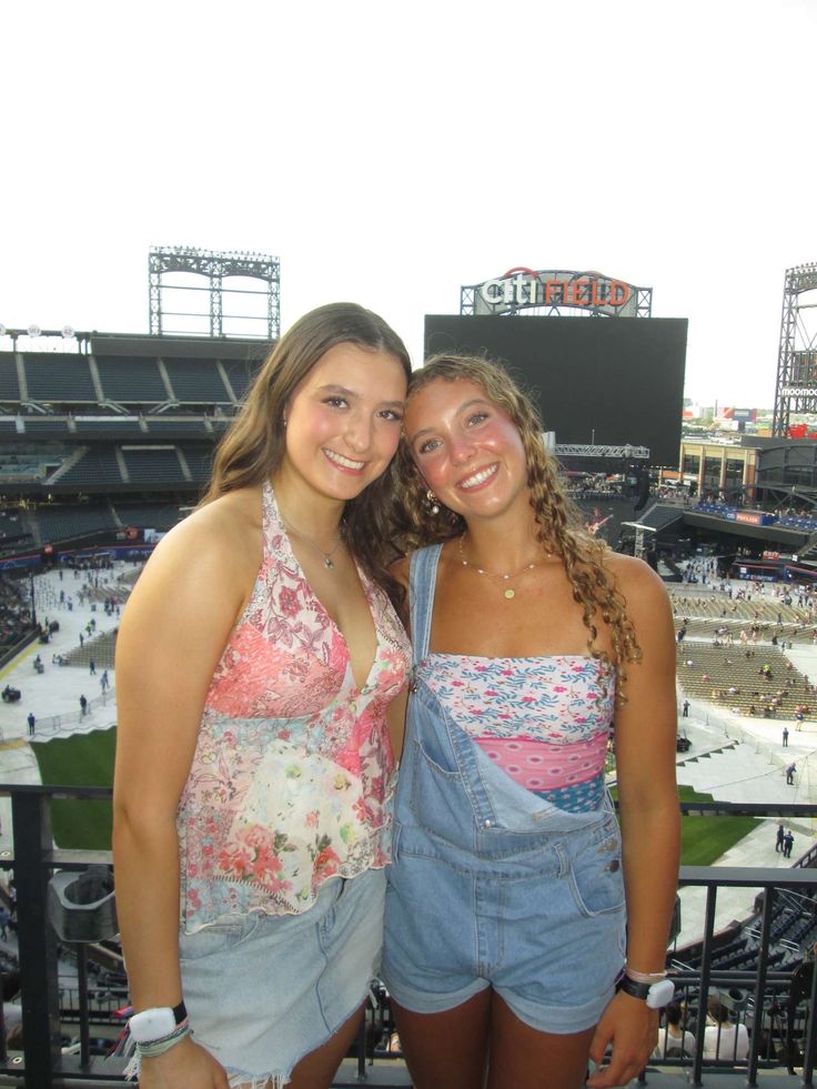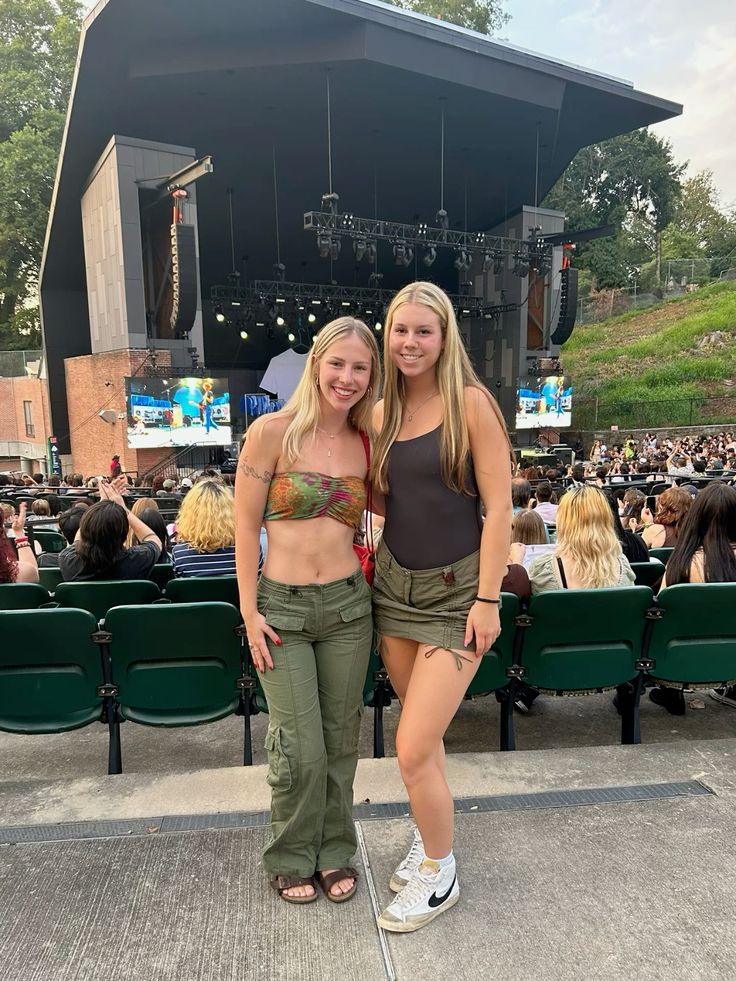Green cargo pants at a concert are so underrated. You get the pockets, the cool girl energy, and zero regret about comfort when you are standing for three hours. The printed tube top keeps it fun and festival ready. Her friend went the cargo skirt route with a simple tank and sneakers, and together they basically nailed the effortless duo look. Sandals on the left, Nikes on the right. Both winning.