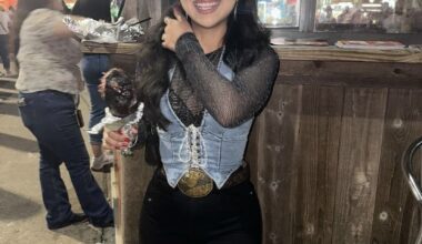 Late night concert energy is a different mood entirely and these two understood that assignment. The lace crop with a denim mini and cowboy boots is a formula that will never let you down, especially once the confetti hits the floor and the lights go warm. The concho belt on the right adds that extra country detail that feels so right for this setting. So much fun.
