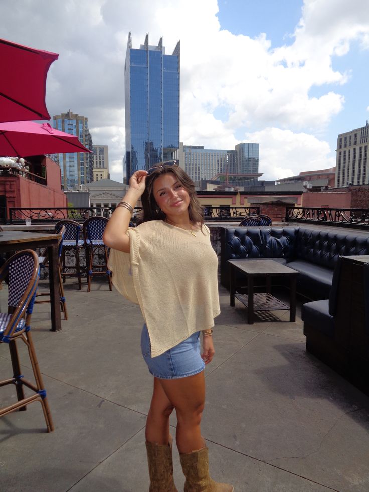 Nobody talks about how well an oversized cream knit top works for a rooftop bar or pre concert hang, but here we are. It is cozy enough if the evening cools down but styled with a denim mini and tan cowboy boots it still reads as intentional and cute. This is genuinely one of the most practical outfits in this whole guide. Sunglasses up, good vibes only.