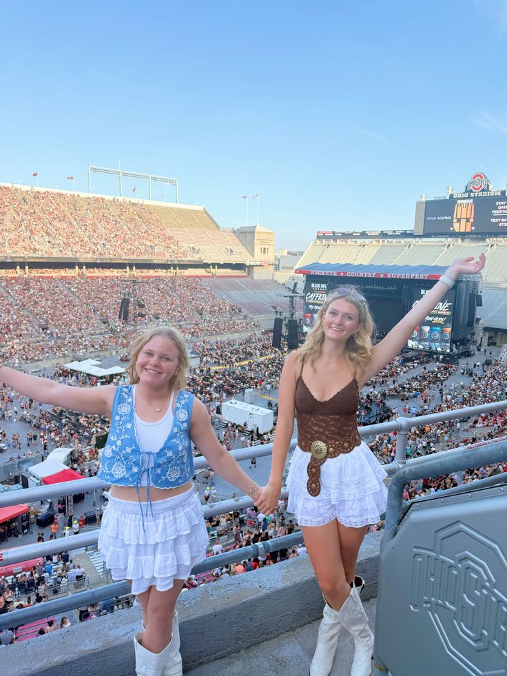 The blue embroidered vest worn open over a white crop with a white tiered mini skirt is genuinely such a good concert look. It has that handcrafted boho feel that works perfectly for country music. Her friend went full commitment with the lace corset top, statement belt and white boots, and honestly both outfits are so strong together. The contrast between the two is what makes the photo work.