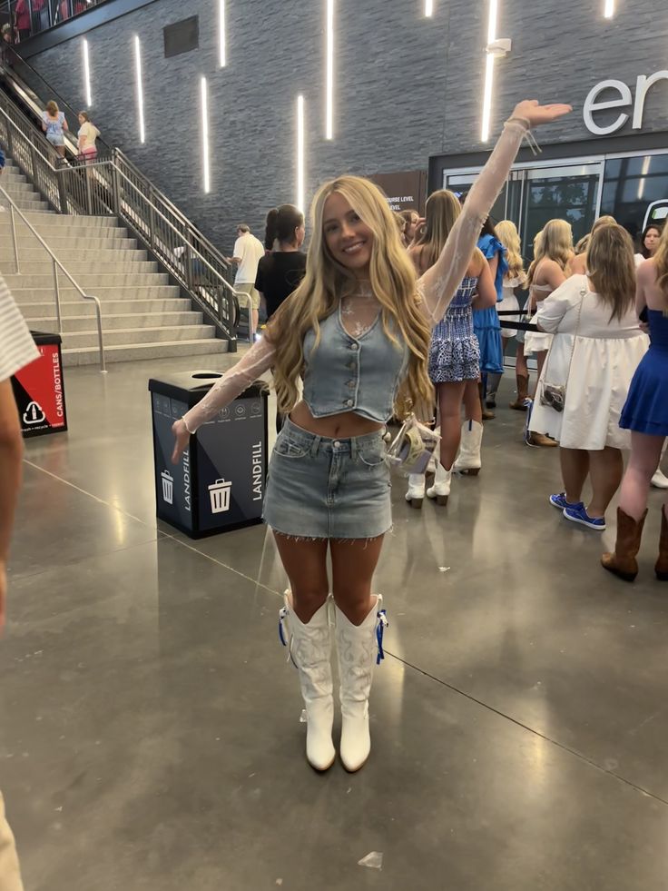 Okayyy so the double denim moment with the lace sleeves layered underneath is so creative and so concert specific. It reads like she put real thought into this while still looking totally effortless. White cowboy boots with a denim vest and mini skirt is the obvious choice but that lace layer underneath is the unexpected detail that makes this whole look memorable. So good.