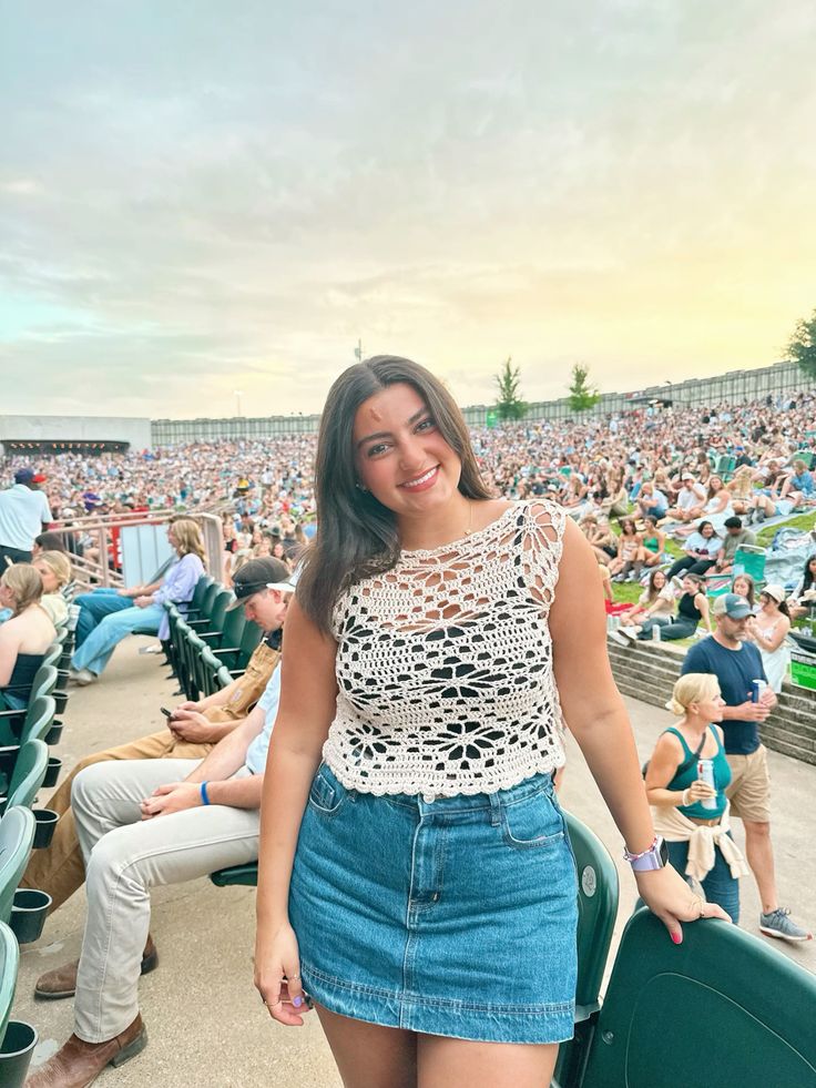 Sometimes the most straightforward outfits hit the hardest. The handmade looking crochet top against a simple denim mini is so breezy and laid back for a summer amphitheatre show. No boots, no cowboy hat, just a really great top doing all the talking. I mean it honestly does not need anything else. If you have a crochet piece sitting in your wardrobe, this is exactly the occasion for it.