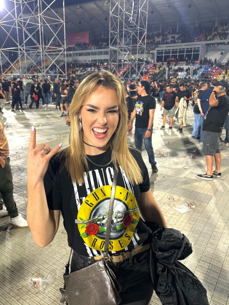 Clean, unfussy, and she’s clearly there for the music. You don’t always need to construct a whole thing. Sometimes showing up in your favourite tee IS the statement.