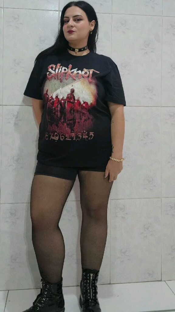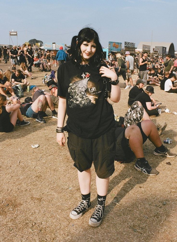 Although it’s technically just a tee and shorts, the details make it unmistakably intentional. This is the outdoor festival version of a metal outfit and it works perfectly.