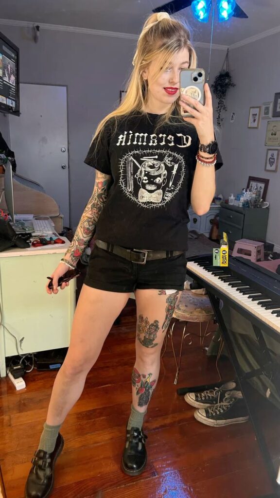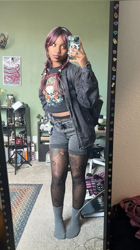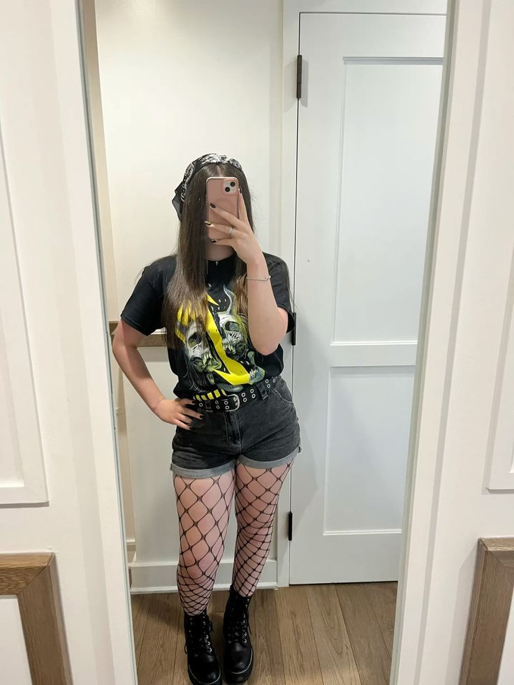 Fishnet tights tucked into a graphic tee and denim shorts with a double grommet belt is genuinely such a solid metal concert formula.