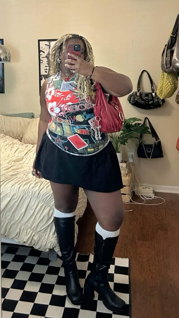 That’s the whole vibe locked in. It’s fun, it’s a little Y2K, and the red bag ties back to the top perfectly.