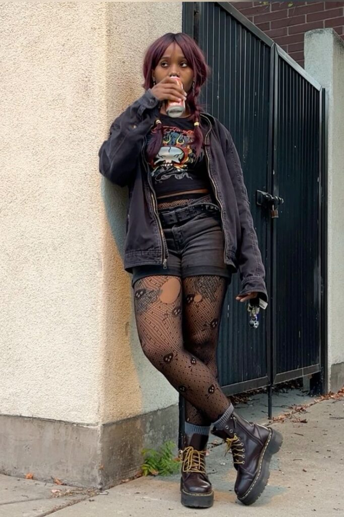 This is that “I throw things on and still look cooler than everyone” energy. The skull fishnet tights against the platform Docs creates this perfect grungy tension.