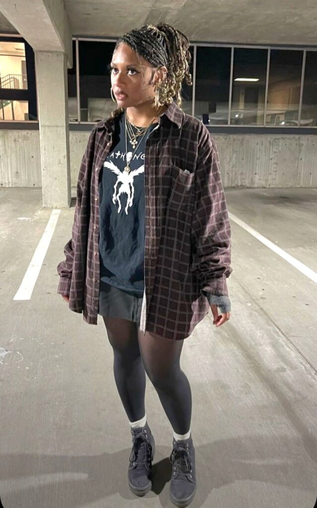 Okay so this look just works, and honestly you know why? Because it’s not trying. Layering an oversized flannel over a band tee is basically the cheat code for metal concerts.