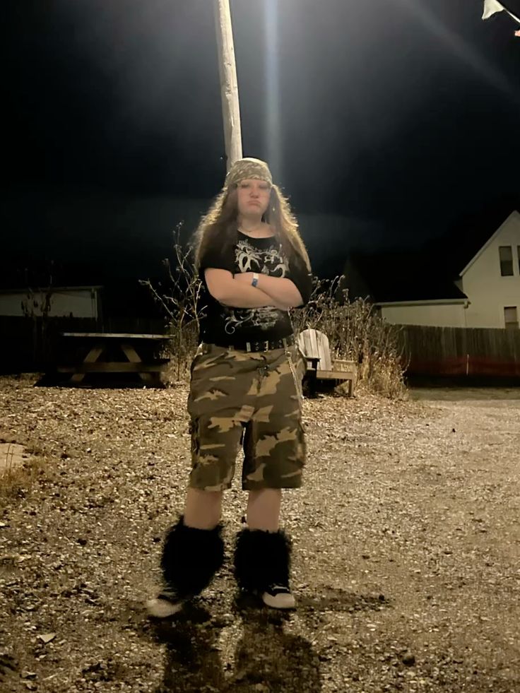 The camo cargo shorts and band tee combo has been a metal concert staple for decades and honestly? Still hits. The fuzzy boot covers are such a wild and fun choice that somehow just works.