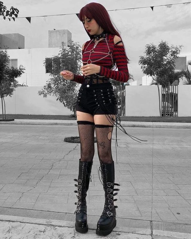 Red striped cold shoulder top, lace up shorts, thigh high fishnets, and those knee high platform boots adorned with heart hardware.
